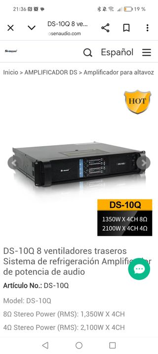 Amplificador de potencia de audio DS-10Q con sistema de refrigeración. - 4 canales. - Potencia RMS 8Ω: 1,350W x 4. - Potencia RMS 4Ω: 2,100W x 4.
