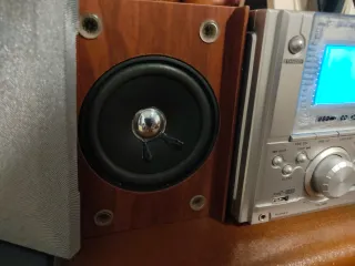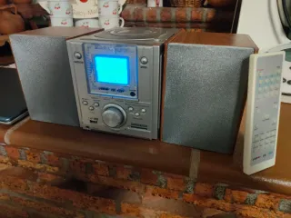 Mini cadena con altavoces y mando a distancia. - Reproduce CD, Radio, USB y tarjeta SD MP3. - Diseño moderno en plata y madera. Funcióna bien, en la pantalla le fallan algúnos píxeles no interfiere en su funcionamiento.