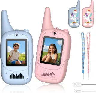 Set de walkie talkies con pantalla de video para niños. Incluye dos unidades en colores azul y rosa, cada una con un diseño de unicornio. - Pantalla a color. - Incluye correas para colgar. - Cables de carga USB. FUNYKICH Walkie Talkie de Video para Niños 3-12 Años(Paquete de 2), Walkie Talkies Recargable con 6 Efectos de Voz, Largo Alcance, Regalo Ideal Cumpleaños, Hogar,Exterior,Patio,Senderismo