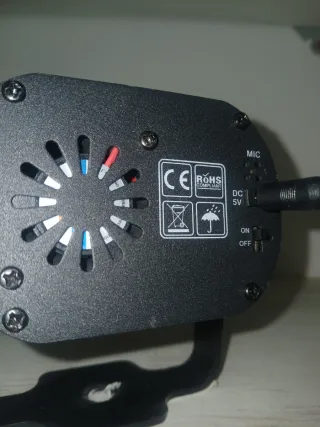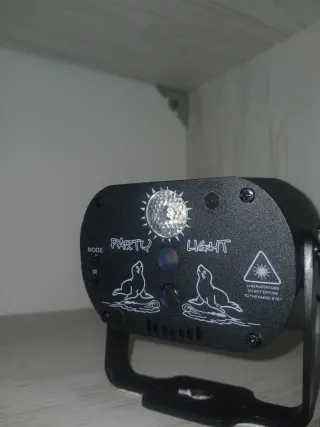 Luz láser para fiestas y eventos. Este dispositivo proyecta patrones de luces dinámicos. - Diseño compacto y portátil. - Carcasa de metal resistente. - Incluye soporte de montaje.