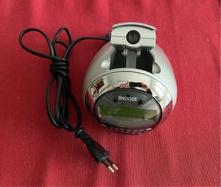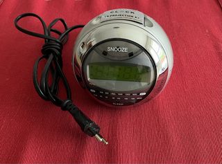 Radio despertador con función de proyección de hora. - Diseño esférico plateado. - Botón SNOOZE y SLEEP. - Sintonizador de radio AM/FM.