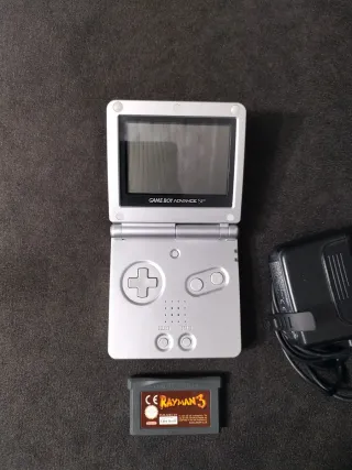 Consola portátil Game Boy Advance SP en color plata. En muy buen estado, con pequeñas marcas de uso. De mi colección personal. Incluye el juego Rayman 3. Funciona correctamente todos los botones, bien de sonido, e imagen nítida, sin pixeles muertos ni arañazos. - Consola plegable. - Incluye cargador original. - Cartucho de juego Rayman 3.