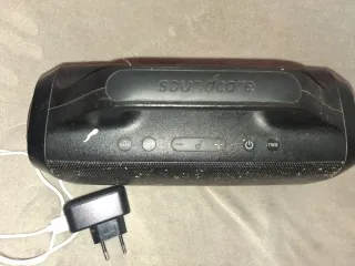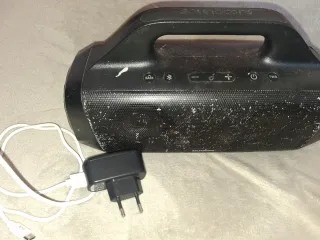 Altavoz portátil Soundcore en color negro. Diseño robusto y asa para facilitar su transporte. - Rejilla frontal protectora. - Botones de control en la parte superior -Cargador Está un poco despintada la rejilla como se aprecia en la foto. Pero funciona estupendamente.