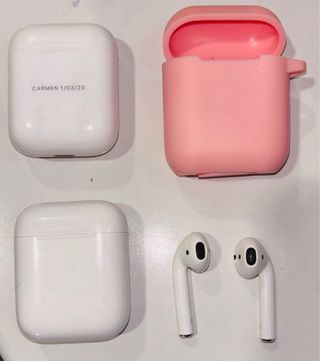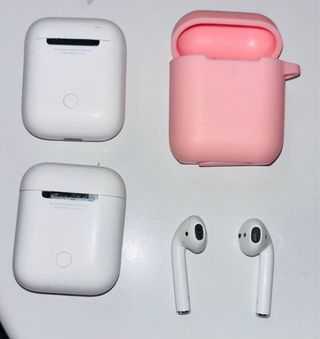 Se venden AirPods de primera generación. - 2 Estuche de carga blanco. - Funda de estuche rosa. - Auriculares blancos.