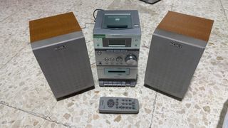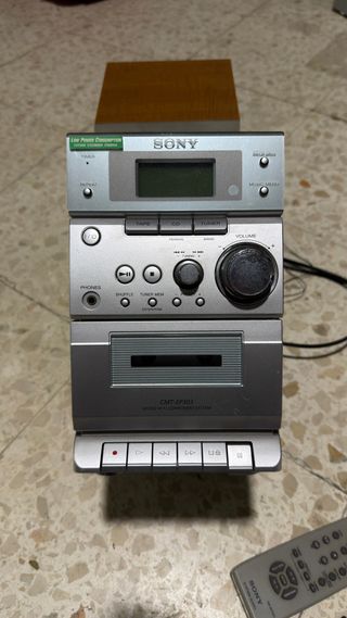 Mini cadena de sonido Sony con reproductor de CD, casete y radio. - Diseño moderno en color plata y madera. - Incluye mando a distancia.