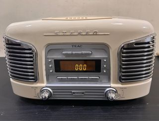 Equipo de sonido compacto con diseño retro. - Función SNOOZE. - Entrada AUX. - Pantalla digital. - Incluye altavoces integrados y salida de sonido (≈20 W total) - Reproduce CDs (incluyendo CD-R) y funciona como sintonizador digital de radio.
