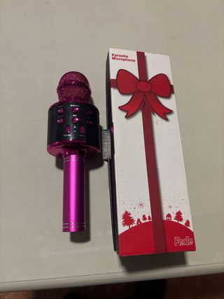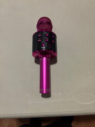 Micrófono portátil para karaoke con un diseño llamativo. - Acabado brillante en color rosa. - Detalles en negro en la zona de controles.