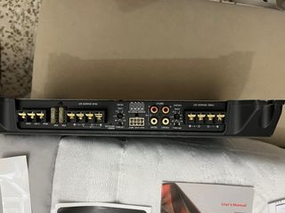 Amplificador de audio para coche, ideal para mejorar el sonido de tu vehículo. - Conexiones para altavoces delanteros y traseros. - Entradas de alta y baja frecuencia. - Fusibles de protección de 25A.