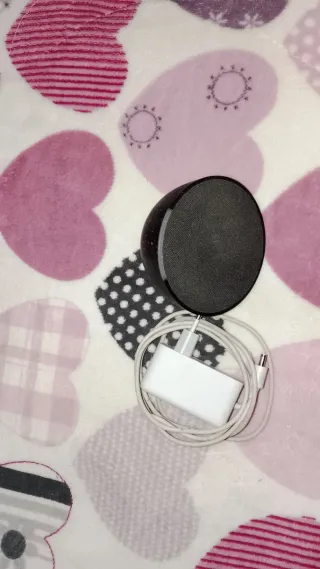 Dispositivo Alexa de Amazon en color negro con cargador blanco. - Diseño moderno y compacto. - Botones de control en la parte superior.