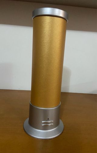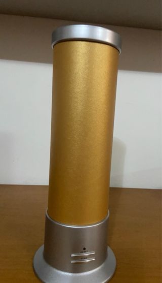 Altavoz inalámbrico con un diseño elegante y moderno. Funciona a pilas, nuevo a estrenar. Se entrega en su propia caja.8 - Acabado en color dorado y plateado. - Base con botones de control. Medidas: Alto 30 crms Diametro superior 9,5 ctm Diametro base 12 ctms