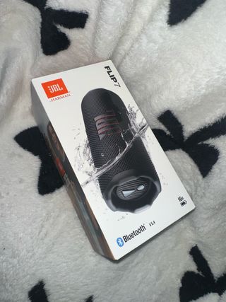 Altavoz portátil JBL Flip 7 en color negro. Disfruta de tu música con un sonido potente y diseño resistente. - Conectividad Bluetooth v5.4. - Autonomía de hasta 16 horas.