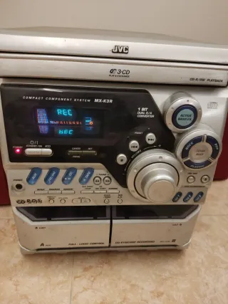 Sistema de sonido compacto JVC MX-K3R con altavoces. - Reproductor de CD de 3 discos - Sintonizador de radio AM/FM. Se le puede poner bluetooth