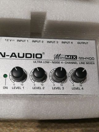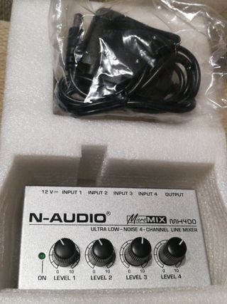 Mezclador de línea de 4 canales N-AUDIO MicroMIX MH400. Con alimentador de 12 v incluįdo - Diseño compacto y ligero. - Indicador LED de encendido. - Control de nivel individual para cada canal.