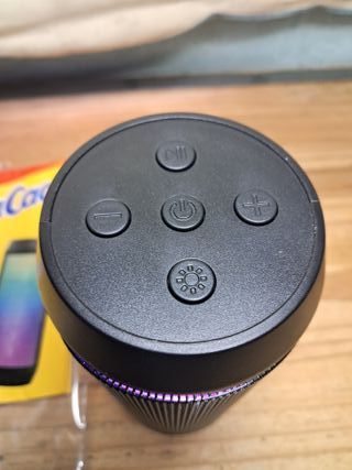Nuevo, sin usar (ver fotos). Se vincula mediante bluetooth. Reproduce música a la vez que se ilumina mediante luces led. Buena calidad de sonido. Con control de volumen, de reproducción o pausa y control para variar el tipo de luces. Se carga mediante un cable como el del móvil que está incluido. La base tiene un diámetro de 7 cm y mide 18 cm de alto. Más datos en las fotos.