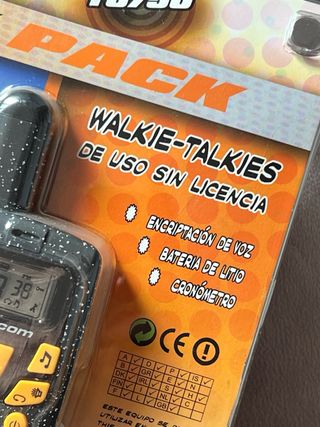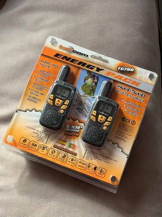 Pack de dos walkie-talkies Talk.com modelo TC750. - Alcance de hasta 5 km. - Radio y cronómetro integrados - 8 canales y 38 subtonos. - Incluye 1 cargador doble de batería, 2 cargadores de viaje, 2 cargadores de mechero, 2 manos libres portátiles y 2 fundas de transporte.