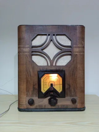 Radio antigua con un diseño clásico y elegante. Un objeto decorativo con un toque retro. Medidas: 43 x 32 x22 Madera. Altavoz textil - Frontal con detalles dorados. - Altavoz con rejilla de tela. - Mandos y botones frontales. No sé si funciona correctamente, se enciende una luz ,hace ruido,en todo caso es a 125.