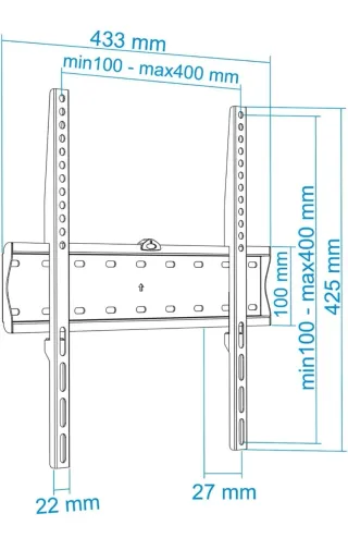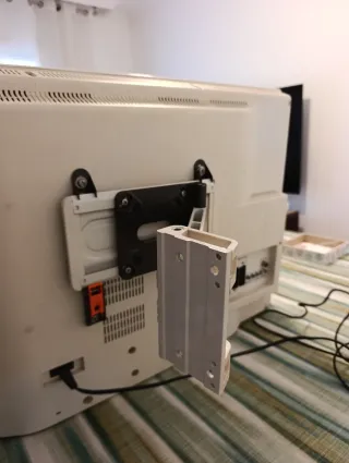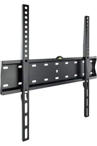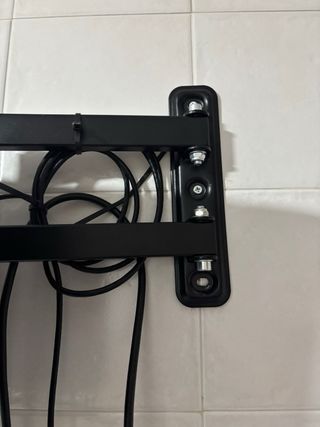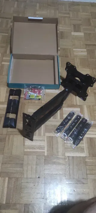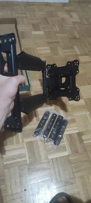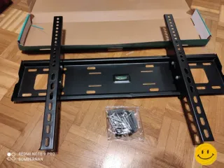 Soporte de pared para televisores, fabricado en metal negro. Incluye nivel para una instalación precisa. Está nuevo en su caja precintada sin abrir. No llegué a instalarlo porque al final no lo necesité. - Válido para TV de 32 a 55 pulgadas. - Carga máxima 40 kg. - Distancia a pared 27 mm. - Diseño robusto y duradero. - Brazos ajustables para diferentes tamaños de TV. - Compatible con sistemas de montaje VESA máximo 400x400.