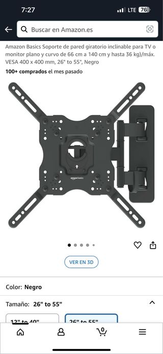 Soporte de pared para TV Amazon Basics, giratorio e inclinable. Está en perfecto estado. - Permite la inclinación y giro de la pantalla. - Válido para televisores de 26" a 55". - Capacidad de hasta 36 kg. - Color negro.