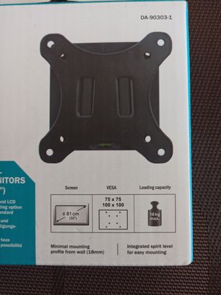 Soporte de pared universal para monitores LED y LCD de hasta 32 pulgadas. - Compatible con estándar VESA. - Carga máxima de 18 kg. - Perfil de montaje mínimo de 18 mm. - Nivel de burbuja integrado para una fácil instalación.