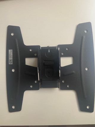 Soporte de pared para televisor. Es de color plata y parece estar en buen estado. - Medidas aproximadas: 10 cm x 10 cm. - Material: Metal.