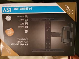 Soporte de pared para televisor, con brazo articulado. Es de color negro y parece estar en buen estado. - Permite una inclinación y giro del televisor. - Fácil instalación. - Material resistente. Sin caja original Incluye tornillos Marca ISY