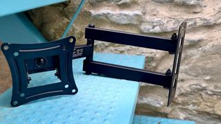 Soporte de pared para televisor de la marca Fonestar. Está en buen estado y listo para usar. Incluye dos brazos articulados y la placa de montaje. - Permite una inclinación regulable. - Incluye todo el material de montaje. - Fabricado en metal resistente de color gris.