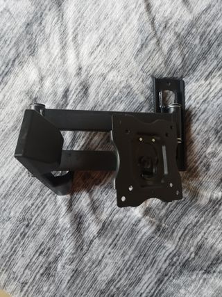 Soporte de pared para TV de hasta 42 pulgadas, con movimiento. Está en buen estado, aunque presenta algunas marcas de uso. - Permite la inclinación y giro de la pantalla. - Incluye todo lo necesario para su instalación. - Ideal para televisores de hasta 42 pulgadas.
