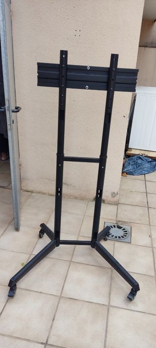 Soporte vertical para TV con ruedas, ideal para colocar tu pantalla en cualquier lugar. Su diseño es robusto y funcional. 100€ nuevo en tienda. No se envia solo recogida. - Base amplia y estable. - Ruedas para fácil movilidad. - Bandeja para dispositivos. - Estructura metálica resistente.