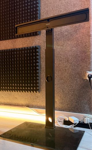 Soporte para televisión de la marca SONTEC. Su diseño moderno se adapta a diferentes espacios. - Base de cristal negro. - Columna central ajustable en altura. - Brazo superior para fijación del televisor.