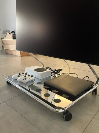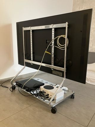 Soporte para TV con un acabado cromado brillante y ruedas para facilitar su movilidad. Se encuentra nuevo en su caja original, aunque presenta un pequeño golpe. FedEx dejó caer el paquete, dañando la caja y abollando la bandeja de metal. - Diseño moderno y elegante. - Estructura metálica cromada. - Base con ruedas para desplazamiento. Valor original: €670 No incluye el televisor ni el Xbox.