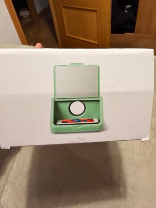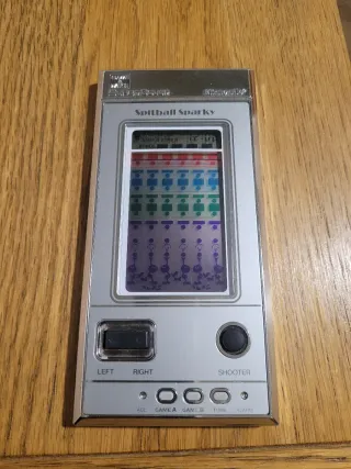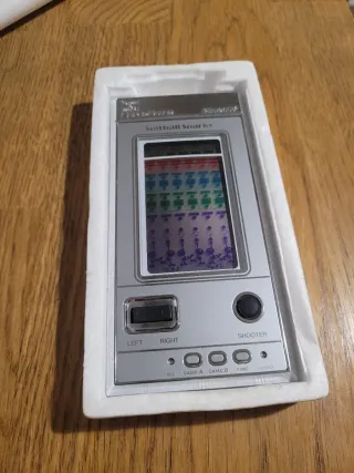 Consola portátil clásica de Nintendo. - Diseño plateado y multicolor. - Pantalla LCD con gráficos retro.