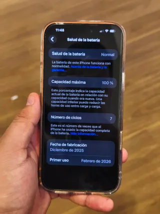 iPhone 17 Pro Max en excelente estado. - Salud de la batería: Normal - Capacidad máxima: 100% - Número de ciclos: 7 - Fecha de fabricación: Diciembre de 2025 - Primer uso: Febrero de 2026