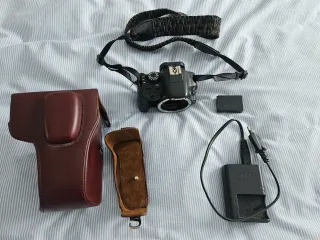 Se vende cámara Canon 100D en color negro, junto con varios accesorios. - Funda de cuero marrón. - Cargador de batería. - Batería. - Correa Funciona perfectamente.