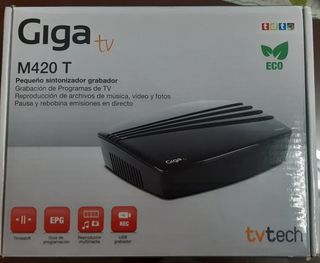 Sintonizador grabador TDT Giga tv M420 T. - Pequeño sintonizador grabador. - Grabación de programas de TV. - Reproducción de archivos de música, vídeo y fotos. - Pausa y rebobina emisiones en directo. - Funciones: Timeshift, Guía de programación (EPG), Reproductor multimedia, USB grabador. - Certificación ECO.