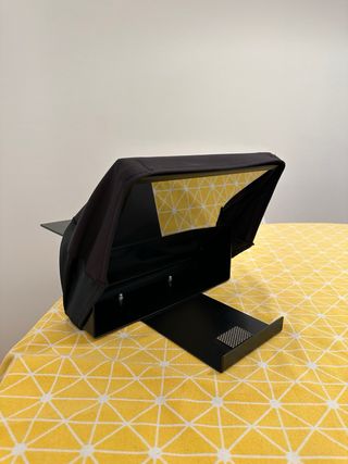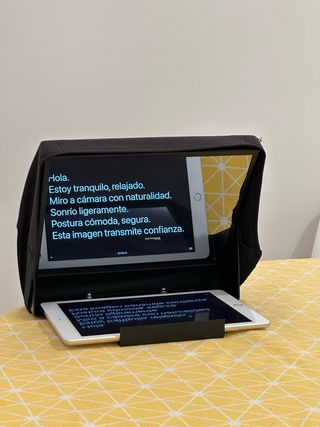 Este teleprompter te permite leer un guion mientras miras a cámara. Es ideal para grabaciones. Está impoluto, sin ningún rasguño. Siempre se usó en casa. Lleva 4 años guardado sin usar. - Pantalla de 12 pulgadas. - Compatible con tablets y smartphones (el iPad en la foto no está incluido) - Se puede montar en un trípode.