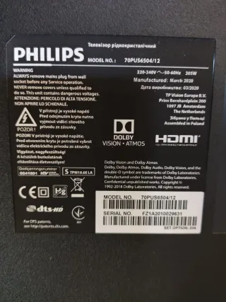Televisor Philips de 70 pulgadas. - Modelo: 70PUS6504/12 - Fabricado en marzo de 2020. - Resolución: 4K UHD. TV para piezas únicamente cuento con toda la parte interna Fuente Main T-com Y las patas de soporte Altavoces y todos los componentes internos