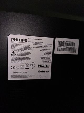 Televisor Philips de 49 pulgadas con resolución 4K. Modelo 49PUS6031/12 - Pantalla de 49 pulgadas. - Resolución 4K. Conexiones: Euroconector Vídeo YPbPr 2x HDMI VGA AV PC/YPbPr SPDIF Auriculares 2x USB CI Ethernet Subwoofer No sé qué funciones Smart tiene ni si funcionan, ya que siempre lo he usado con una box. Por lo que he visto, el botón de Netflix funciona normalmente. Reemplacé los LED hace unos años, hay un brillo muy leve en las esquinas como se ve en las fotos, pero nunca me afectó. Incluyo el mando y el soporte que también se puede usar en otros televisores. En Sitio de Calahonda