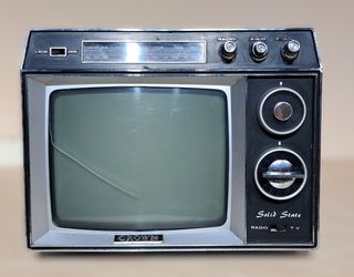Televisor portátil de 12 pulgadas, marca EMERSON, modelo HAPPY. Pantalla de tubo. Se puede enchufar a la corriente, pero solo se ve "nieve". Está en buen estado, aunque el color blanco original ha ido amarilleando. Un buen objeto, y regalo, para coleccionistas de televisores antiguos.