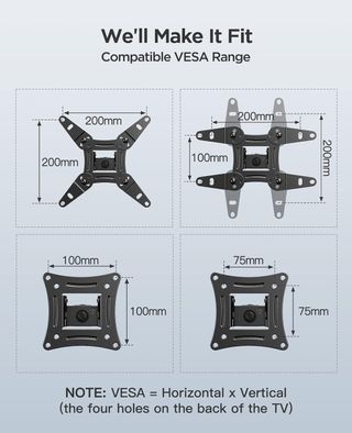 Soporte de pared para televisores de 13 a 40 pulgadas. Permite ajustar la posición de tu TV. TAMAÑO DE PANTALLA - Es adecuado para todas las pantallas con tamaños de entre 13 y 43 pulgadas GIRATORIO E INCLINABLE- Giro variable (180°) e inclinación ajustable (15°) para crear una posición de visionado ideal DIMENSIONES VESA - 75x75 100x100 200x100 200x200. VESA es un estándar que indica la distancia entre los agujeros en la parte posterior del televisor FÁCIL INSTALACIÓN - Todos los materiales para el montaje como los tornillos, anclajes y separadores vienen incluidos con el soporte y se pueden configurar de forma rápida y sencilla