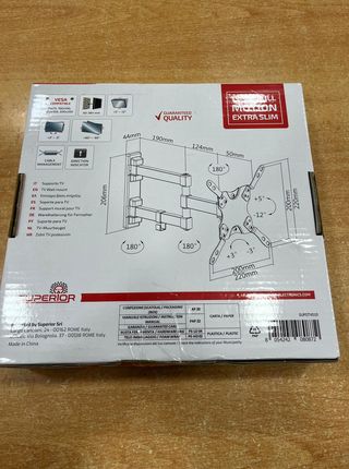 Soporte de pared universal para televisores. Sólo colocado, nunca utilizado por cambio de ubicación de la tv. Comprado en Calbet. Desmontado y está dentro de su caja. - Compatible con pantallas de 13 a 65 pulgadas (33-165 cm). - Soporta hasta 30 kg de peso. - Permite giro de 180° y una inclinación de 15°. - Distancia a la pared de 49 mm. - Compatible con VESA hasta 400 x 400.