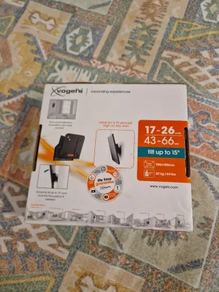 Soporte de pared universal para TV de la marca Vogel's. Permite inclinar la pantalla hasta 15 grados. - Diseñado para televisores de 17 a 26 pulgadas (43-66 cm). - Instalación sencilla y segura.