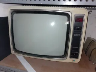 Televisor antiguo de la marca Grundig, modelo Super Color. - Pantalla de 18 pulgadas. - Diseño retro en color beige y detalles multicolor.