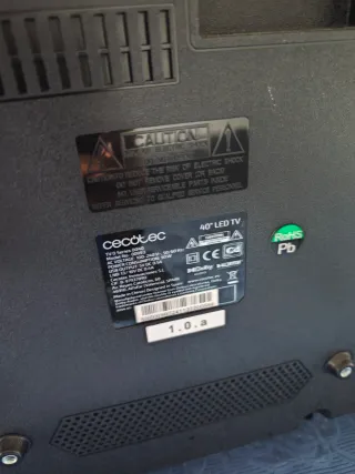Televisor LED de 40 pulgadas de la marca Cecotec. - Modelo: 00993 - Voltaje AC: 100-240 V, 50/60 Hz - Consumo: 90 W - Salida USB: 5V DC 0.5A - LNB: 13/18V DC 0.4A - Fabricado en China, diseñado en España.