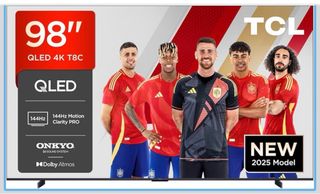 Televisor TCL de 98 pulgadas con tecnología QLED 4K. - Pantalla QLED 4K T8C. - Tasa de refresco de 144Hz Motion Clarity PRO. - Sistema de sonido ONKYO 2.1. - Compatible con Dolby Atmos. - Modelo 2025.