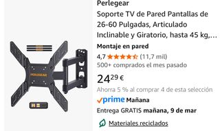 🔴NUEVO A ESTRENAR🔴 HACEMOS ENVÍO🔴S 📦 POR AQUÍ POR WALLAPOP O EN VENTA EN MANO. Soporte tv 🔴ALTA CALIDAD🔴 brazo UNIVERSAL extensible 26-65 PULGADAS y max30KG °vesa 40, nuevo a estrenar en su embalaje original.Extensible a 🔴36cm🔴,giratorio inclinables adecuado según el fabricante para pantallas de televisión de tamaños entre 26y65" y un peso de max30kg. La distancia de los agujeros para la tele empieza desde 5x5cm 10x10cm HASTA40x40cm TORNILLOS, tacos para la pared y la pantalla LO BASICO no viene todos los tornillos de todos los modelos del mercado.OJO 14"-18"-20"-22"-24"-28"-32"-40"42"-44"-46"-48"-50"-52"-55-65"
