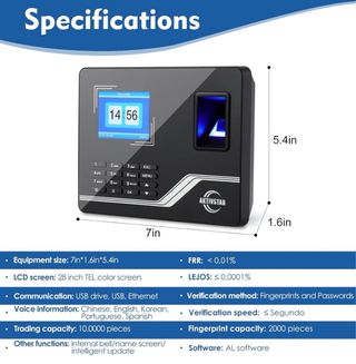 Sistema de control de acceso y registro de personal. - Tamaño del equipo: 7in*1.6in*5.4in - Pantalla LCD a color de 2.8 pulgadas. - Comunicación: USB, Ethernet. - Idiomas: Chino, Inglés, Coreano, Portugués, Español. - Capacidad de registro: 10.0000 piezas. - Tasa de Falsa Aceptación (FRR): < 0,01%. - Tasa de Falsa Rechazo (LEJOS): ≤ 0,0001%. - Método de verificación: Huellas dactilares y contraseñas. - Velocidad de verificación: ≤ Segundo. - Capacidad de huellas dactilares: 2000 piezas. - Software: AL software.