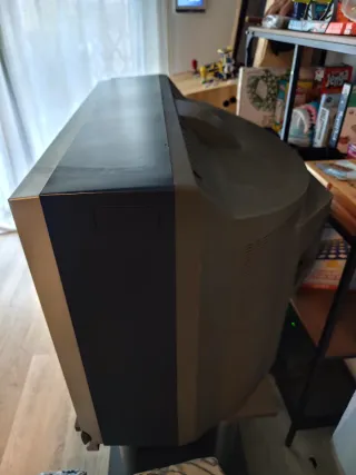 Televisión de alta gama en perfecto estado, un brillo, sonido y calidad espectaculares. Una televisión que pocas personas podían permitirse. Funciona de escándalo para todo tipo de consolas, doble entrada RGB y amplificador para altavoces externos (los que lleva suenan de lujo), desmagnetización automática. Pesa 100kg, te la llevo hasta en coche.