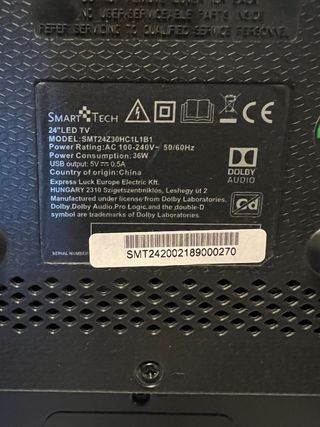 📺 Televisión Smart TV 24” Smart Tech – Full HD – Dolby Audio Vendo Smart TV Smart Tech de 24 pulgadas, en muy buen estado y funcionando perfectamente. 🔹 Marca: Smart Tech 🔹 Modelo: SMT24Z30HC1B1 🔹 Pantalla: 24” LED 🔹 Resolución: Full HD 🔹 Smart TV: Sí 🔹 Audio: Dolby Audio 🔹 Consumo: Bajo (36W) 🔹 Conexiones: HDMI, USB 🔹 Voltaje: 100–240V (compatible en cualquier país) Ideal para dormitorio, cocina, apartamento, caravana o segunda residencia. Tamaño compacto y buena calidad de imagen y sonido. 📦 Se entrega tal cual se ve en las fotos. 📍 Entrega en mano o envío por Wallapop. 💬 Cualquier duda, pregúntame sin compromiso.
