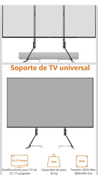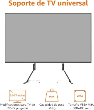 Soporte de TV universal compatible con pantallas de 22 a 77 pulgadas. - Capacidad de peso máxima: 36 kg. - Tamaño VESA máximo: 800x400 mm.