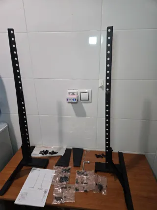Soporte universal para televisores de Amazon Basics. Diseñado para ofrecer estabilidad y un diseño moderno. (Esta Nuevo Se sacaron de las bolsitas para tomar foto de su montaje sencillo y dinamico) - Color negro. - Material metálico resistente. - Incluye todos los accesorios de montaje. Amazon Basics Soporte universal para televisores LCD/LED/plasma de 22 a 77 pulgadas, altura ajustable, compatible con barras de sonido, soporta hasta 36 kg y VESA 800 x 400 mm máximo, color negro. - Material: Hierro - Altura regulable.